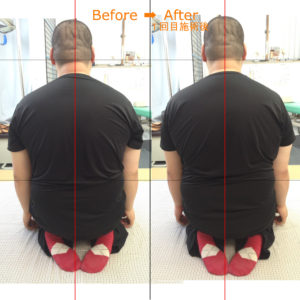 20代男性 頭痛と猫背が気になるということです。 施術後、背筋が伸びて(判りにくいですが)マット面から手の位置が離れている、首の筋の緊張のバランスが取れて頭の傾きが軽減されました。 頭痛は翌日に消失したそうです。頭痛は首の筋肉と、首から頭への血流とが関係する場合があります。