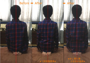 小学6年生 肩関節がゆるい? この子は、肘を舌で舐めることが出来る特技があります。舐めてる時は実際には肩が亜脱臼の状態になっています。 ガチガチに緊張した体よりマシかもしれませんが、緩みすぎた関節は骨格としては体を支えきれていません。 無痛の歪み直しは、適度な緊張感を持たせることも可能です。 筋肉の張り感が整って、綺麗な姿勢になりましたね!