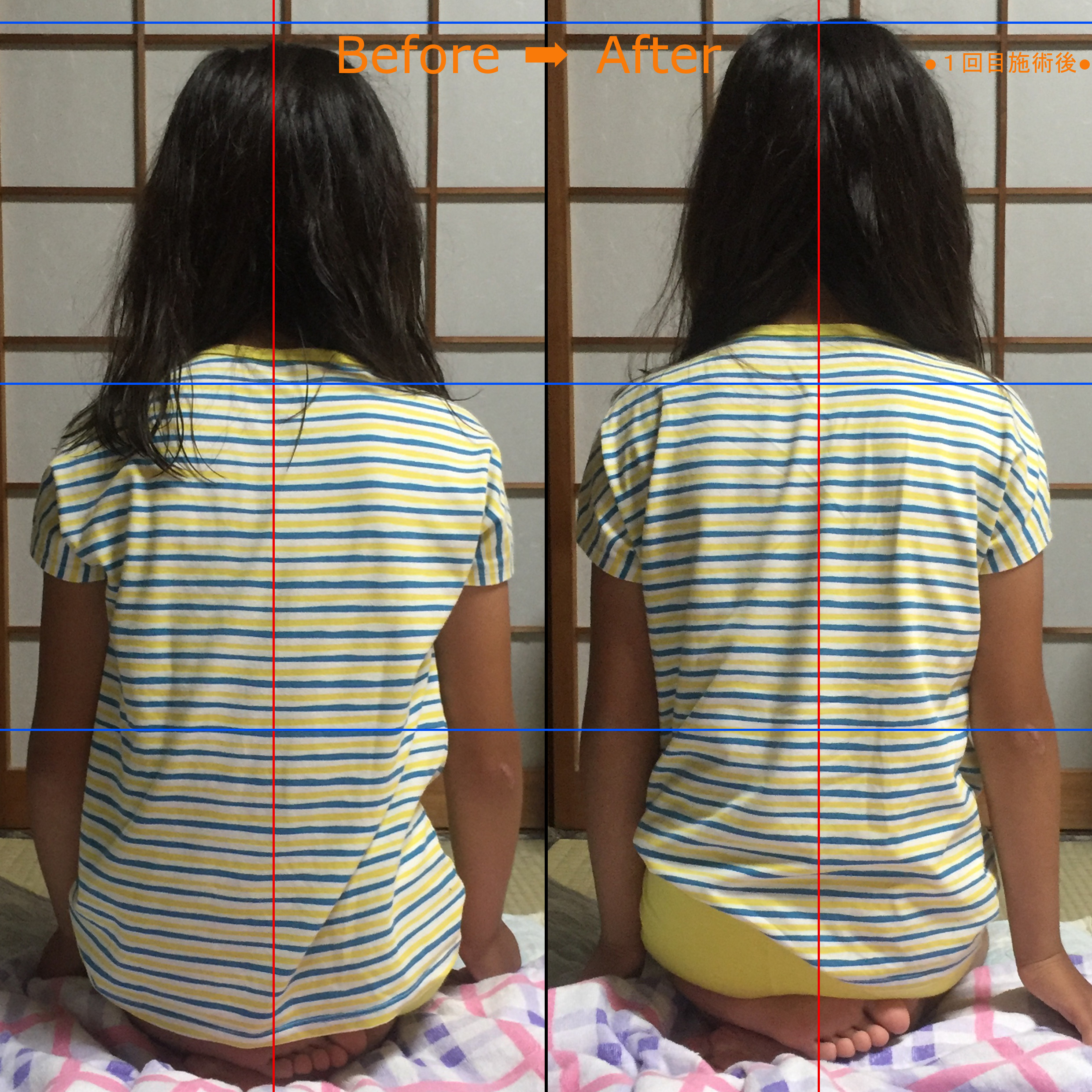 小3の女の子。猫背を指摘されて悩むということでした。 ですが、筋肉のバランスをとれば骨格は本来の位置に整復されます。 自然と頭や肘の位置が施術前よりも上にきました。 「別に気にし過ぎなくても良いよー」と言ってあげました。