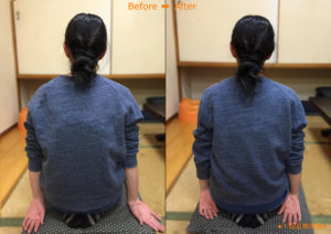 猫背の改善が、背中の出っ張りや手首と床の距離が離れた事からわかります。